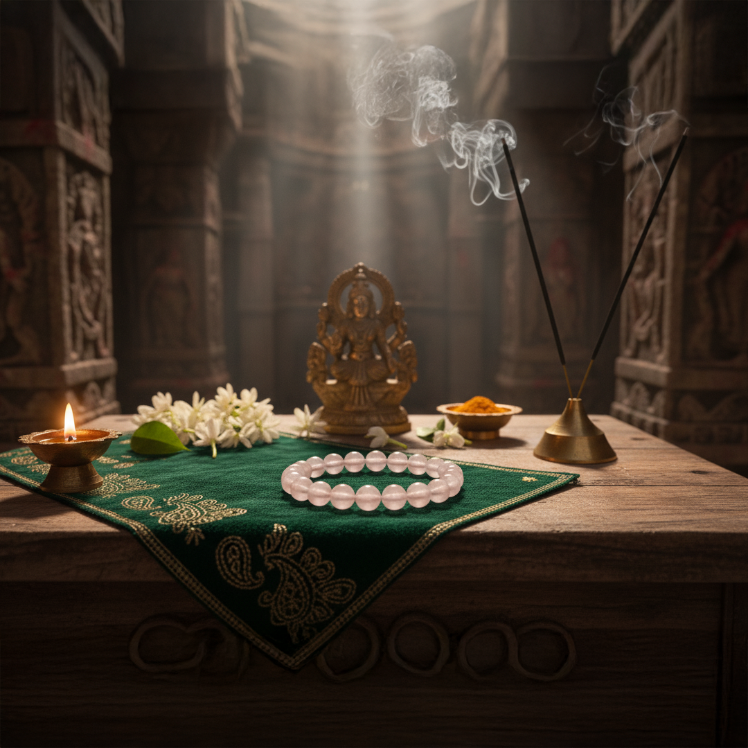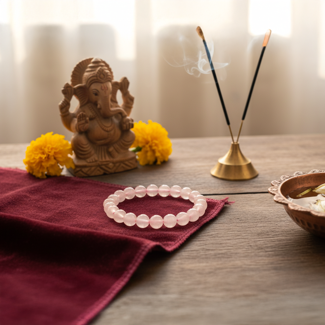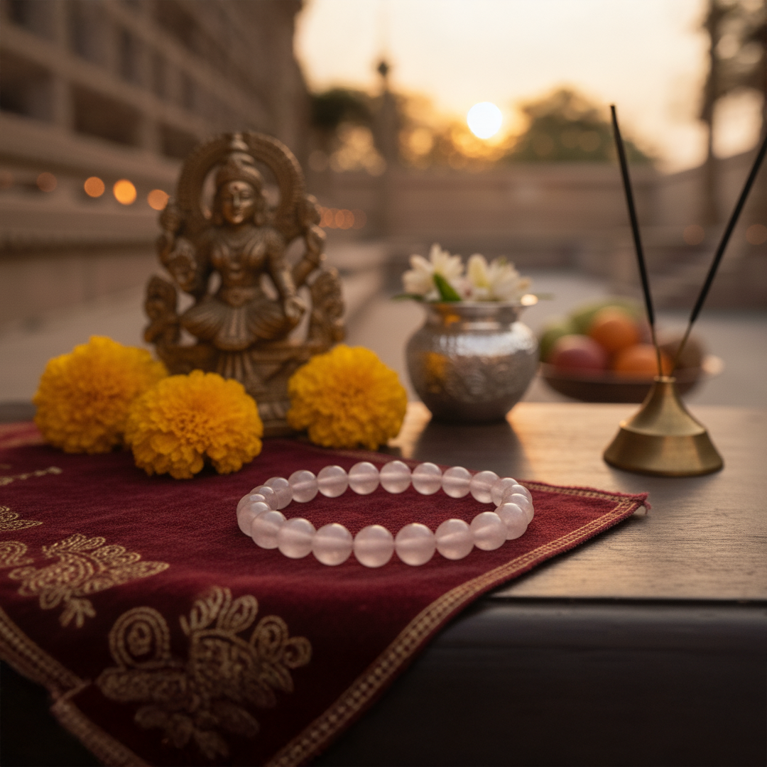 Placed in a traditional Indian spiritual setting, this bracelet captures purity, peace, and divine blessings, making it ideal for daily wear, meditation, gifting, or spiritual practice.